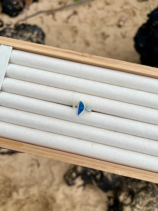 Australian Opal ring w/ a 3mm Swiss Blue Topaz ~ Size 7.5