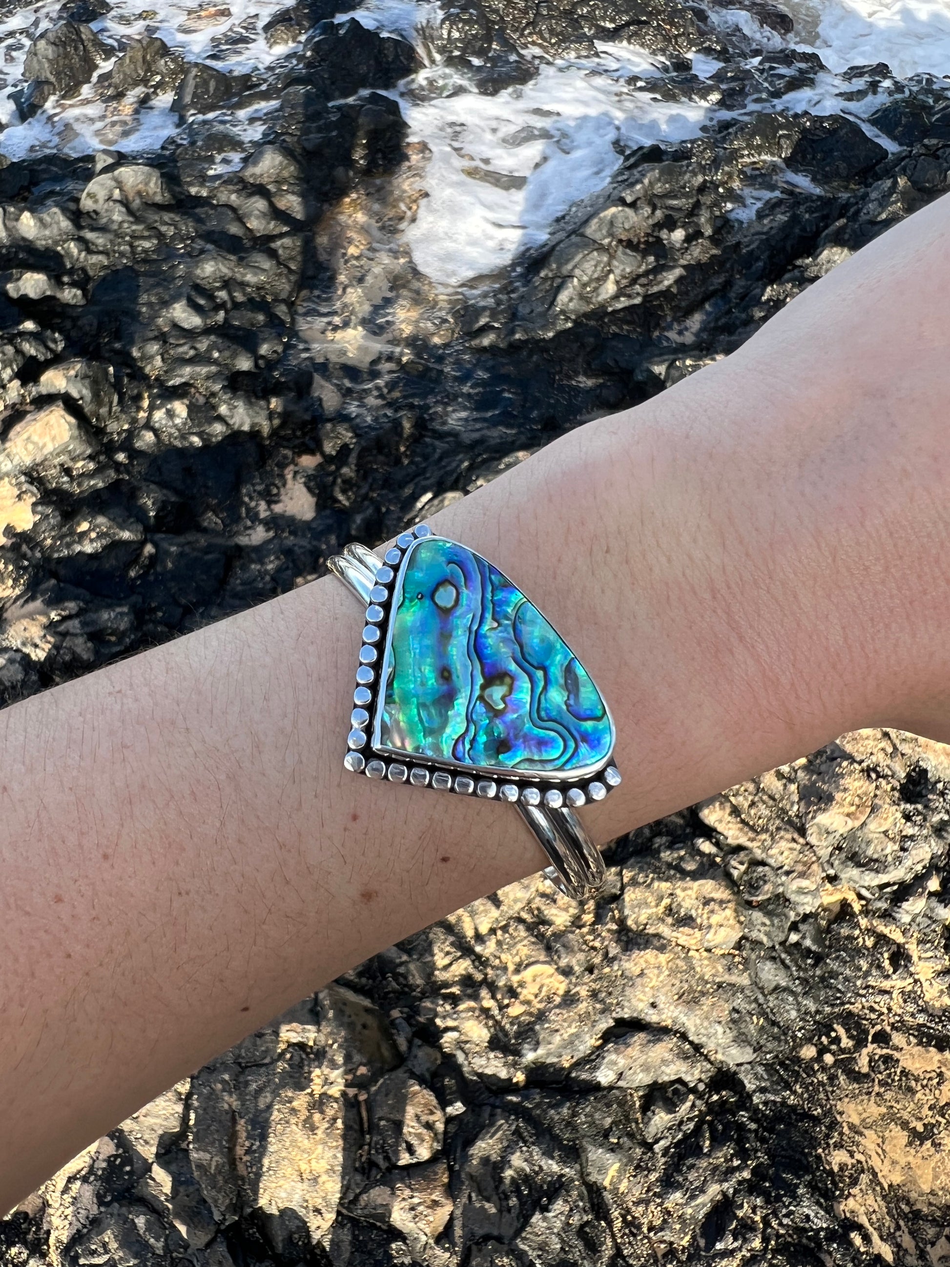 The Mermaid Abalone Cuff is a statement piece all on her own, adorned with studded sterling silver details and a smooth shine finish.